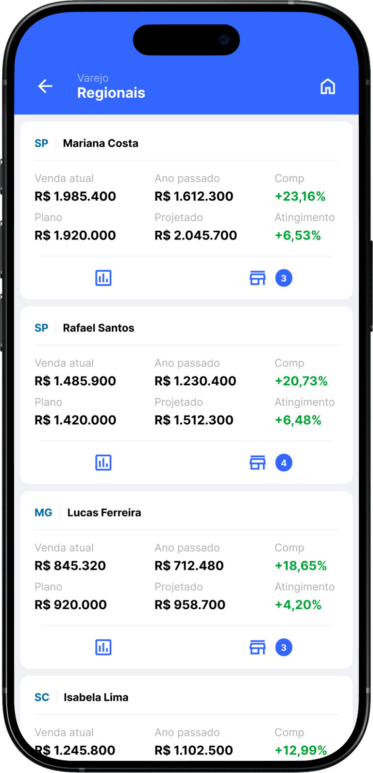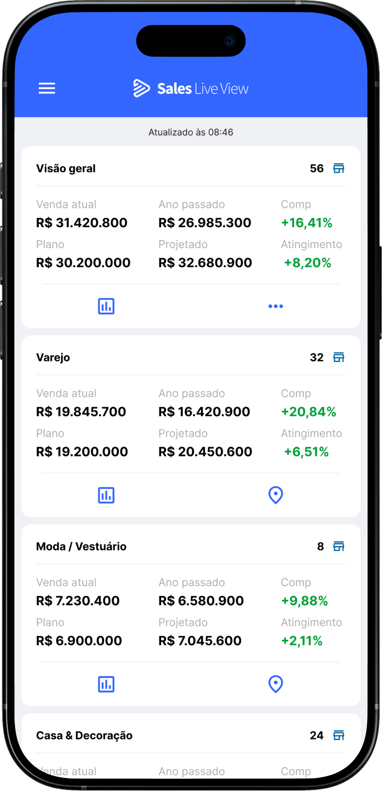 Acompanhe a performance de todas as lojas, categorias e produtos com atualizações a cada minuto. Decisões rápidas, gestão assertiva e resultados imediatos direto no celular.
